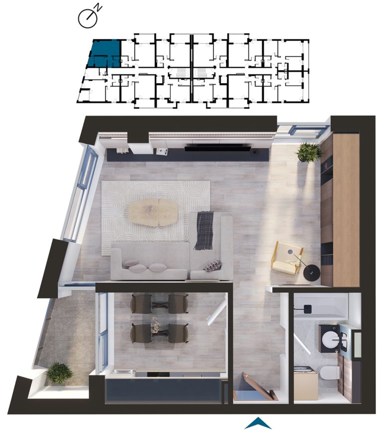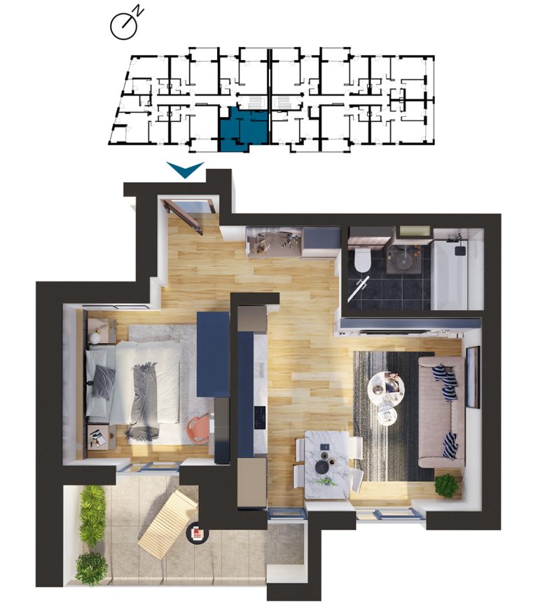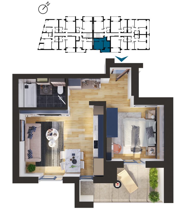 Vizualizați apartamentele cu 1 cameră disponibile în imobilul T2. Apăsați pe apartamentul dorit pentru a afla mai multe informații.